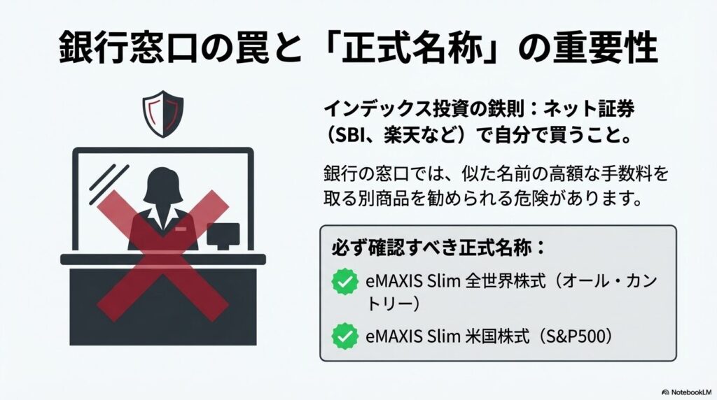 商品を「通称」でしか覚えない情弱を狙って、「全世界株式」と似た名前の「高額な手数料を取る別商品」を売りつける業者がいるんだ。