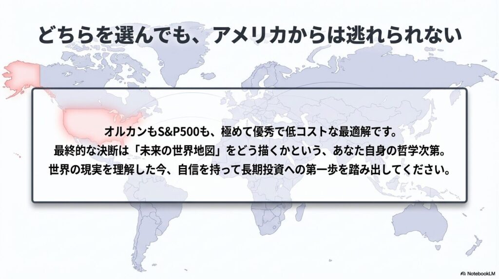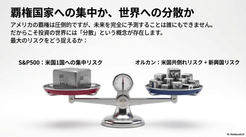 | 最大のリスク | 米国共倒れ + 新興国リスク | 米国1国への集中リスク |