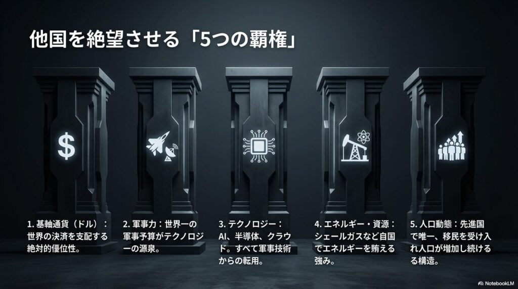 - 基軸通貨(ドル): 世界の決済はドル。これが崩れない限りアメリカは強い。