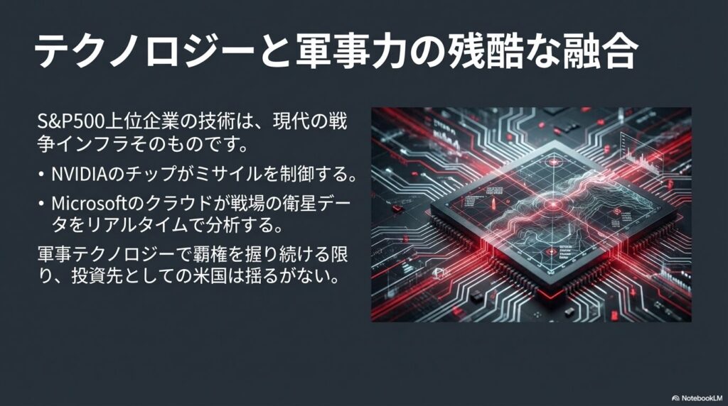 いいか、今イランで飛んでるミサイルの誘導も、戦場をリアルタイムで監視する衛星データも、全部S&P500に入ってる企業の技術だ。
